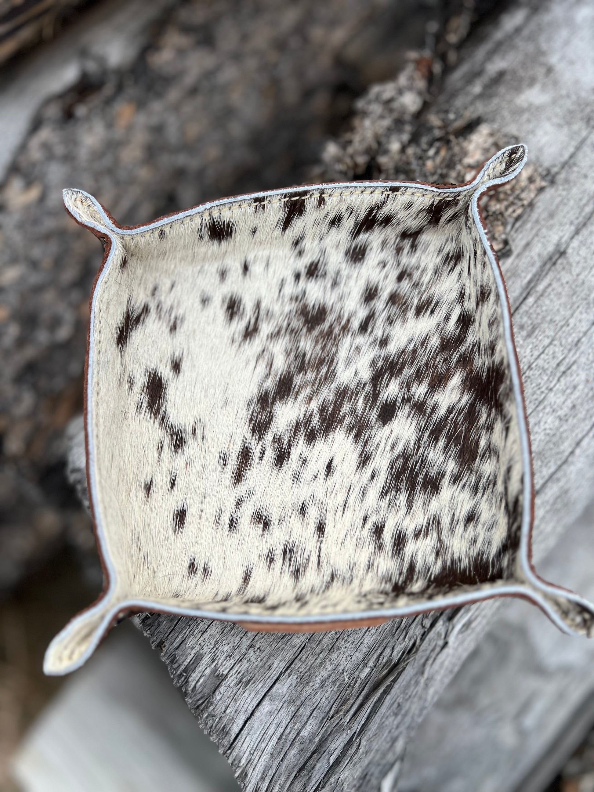 Each tray is double sided leather, 8”x8” then corners riveted (final measurements are slightly under 8”x8” due to the riveting).