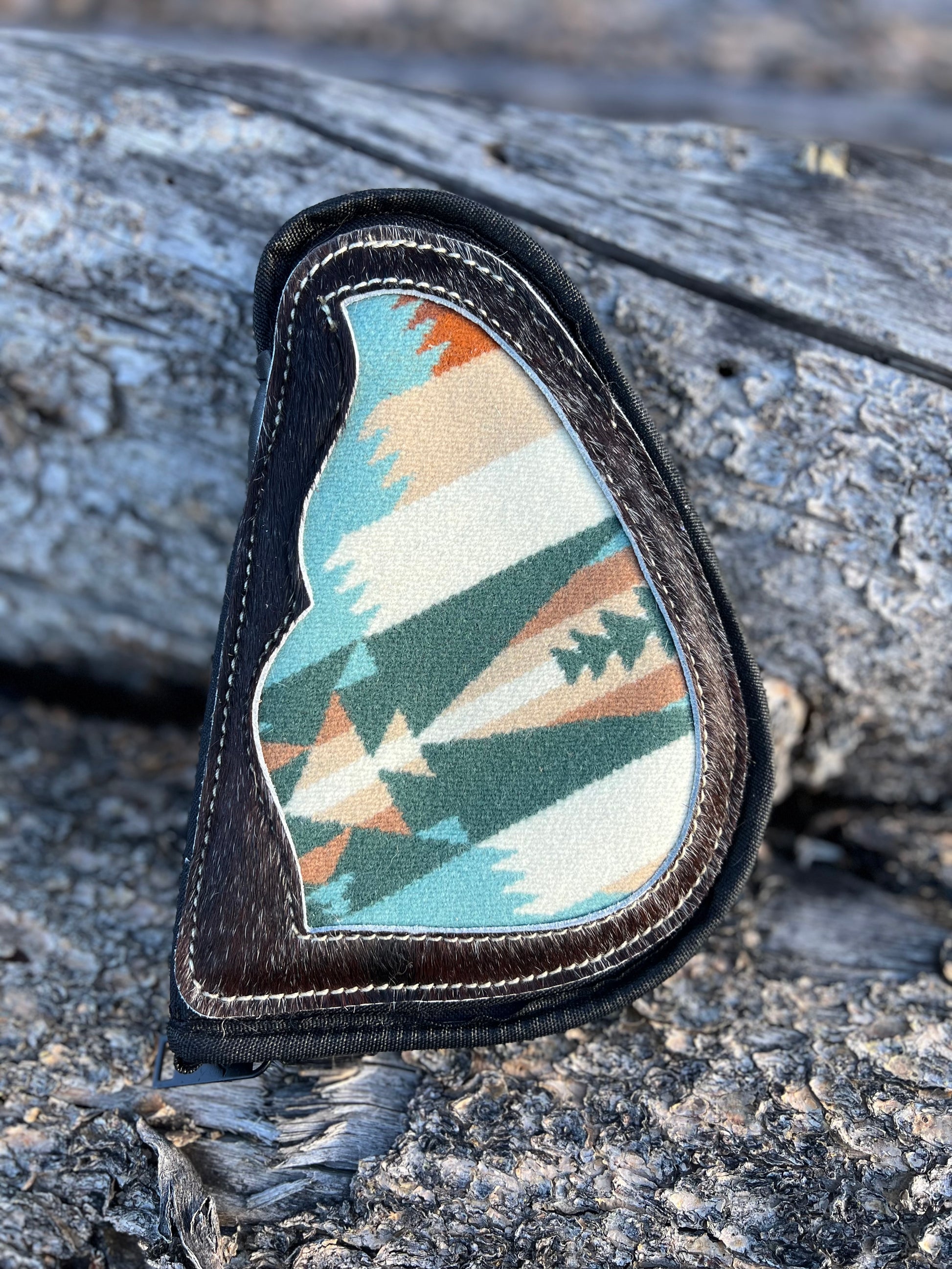 9”W x 6”H - water resistant fabric embellished with cowhide and Pendleton©️Wool - 1” padding