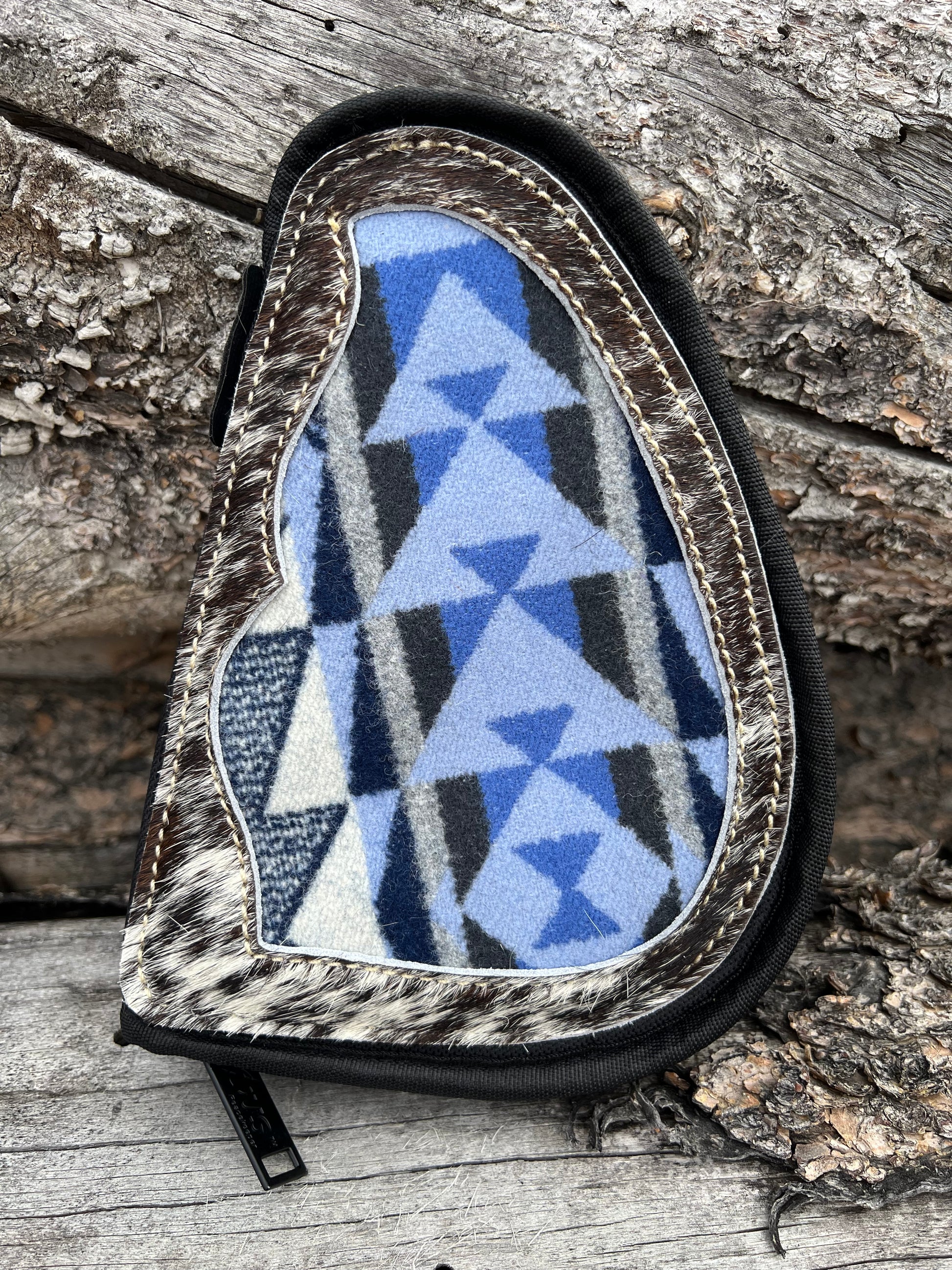9”W x 6”H - water resistant fabric embellished with cowhide and Pendleton©️Wool - 1” padding