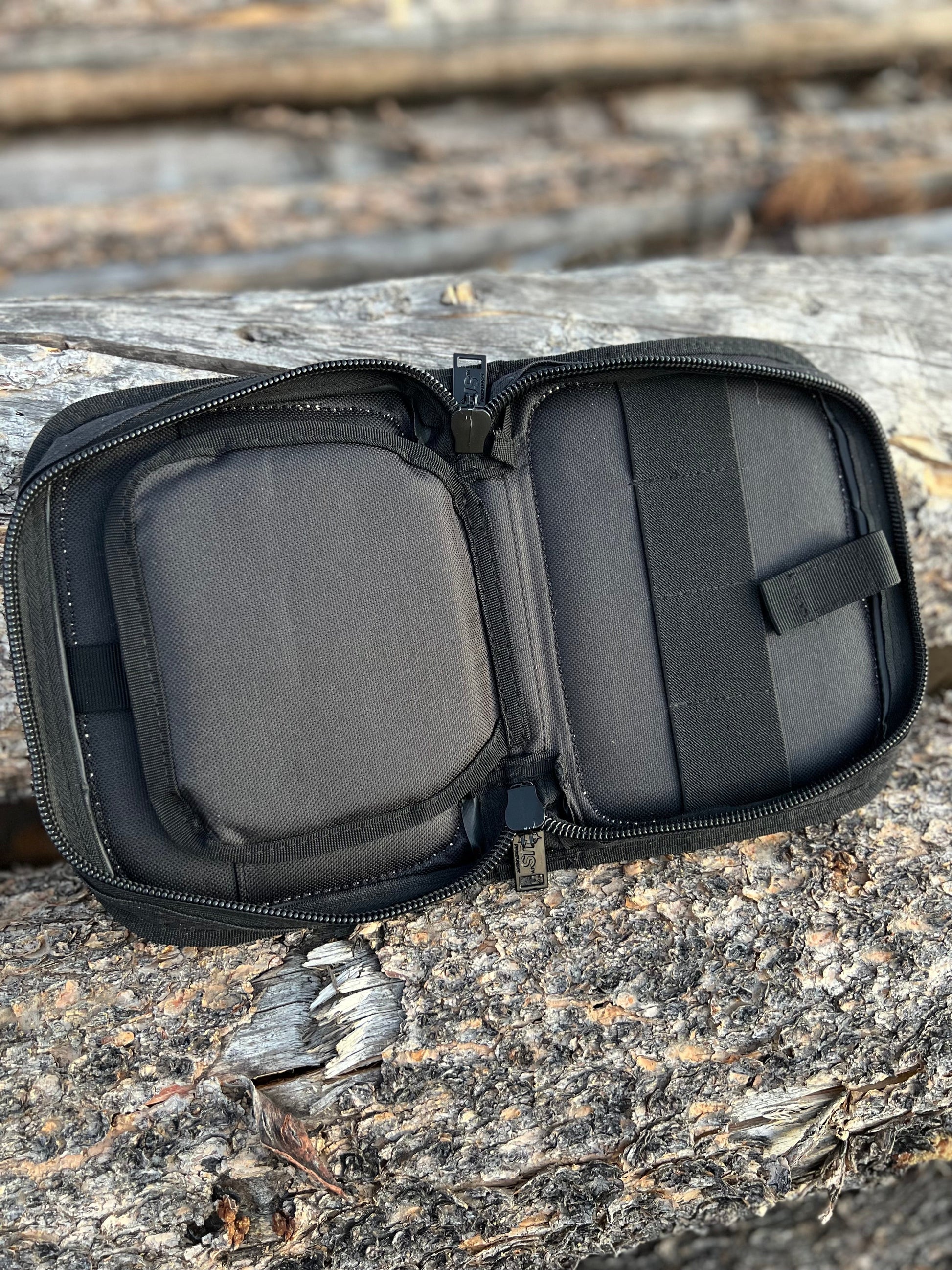 Interior - has 2 sides separated by a divider. One side has a pocket measuring 8.25”x4” while the opposite side has 4 elastic slots for magazines.